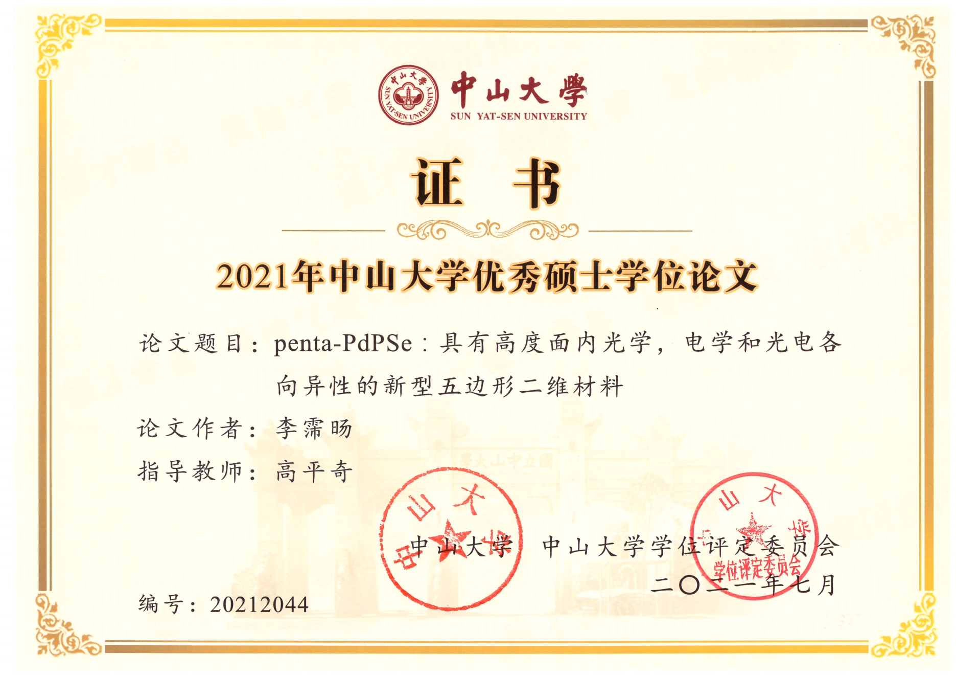 李霈旸同学是我院2021届材料物理与化学专业硕士研究生,现已取得新加坡国立大学电机与计算机学院博士录取通知书,其学位论文荣获中山大学优秀硕士学位论文。