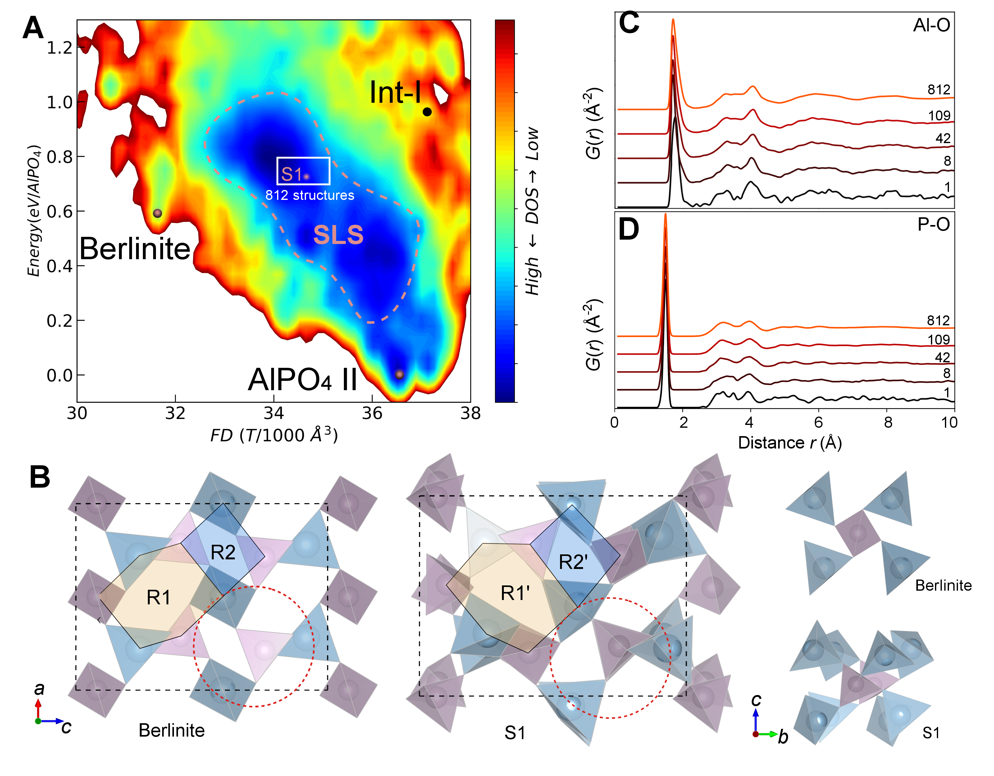 使用随机表面行走法(SSW)进行全局势能面(PES)搜索的结果显示柏林石和AlPO4 II被一群高概率密度结构隔开。然而,连接柏林石和稳定的AlPO4 高压相的晶体相变路线(路径一)将绕过这些高密度结构,AlPO4的短、中、长程有序性均被破坏。该路径包含两个中间结构和三个关键步骤,势垒很高,除非施加热量,否则发生的可能性很低。而在室温15 GPa下,样品更有可能进入高DOS结构区(路径二),该区域中有一群低对称结构(SLS)组成(图a),可以描述玻璃态AlPO4。SLS的高DOS值表明从柏林石到SLS的动力学势垒(如柏林石-S1)较低,从S1到AlPO4 II的路径却因动力学阻碍而缺失,这与实验的结果呼应。以不同采样数计算SLS结构群的G(r)(如Al-O和P-O)(图c-d),结果表明SLS本质上是无平移对称性、中程无序但短程有序的固体。
