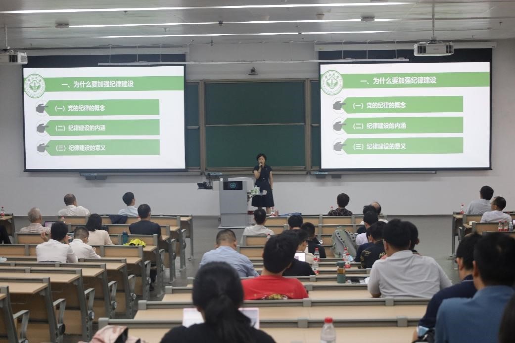 随后,戴红晖书记以“以案为鉴知敬畏,防微杜渐守底线”为主题作警示教育,她再次向全体教职工明确了六项纪律的负面清单,并以具体的案例进行警示教育。她强调,全体教职工要加强纪律意识、规矩意识和廉洁意识,共同营造好学校风清气正的教书育人环境,为学校和学院的发展提供坚实的纪律保障。