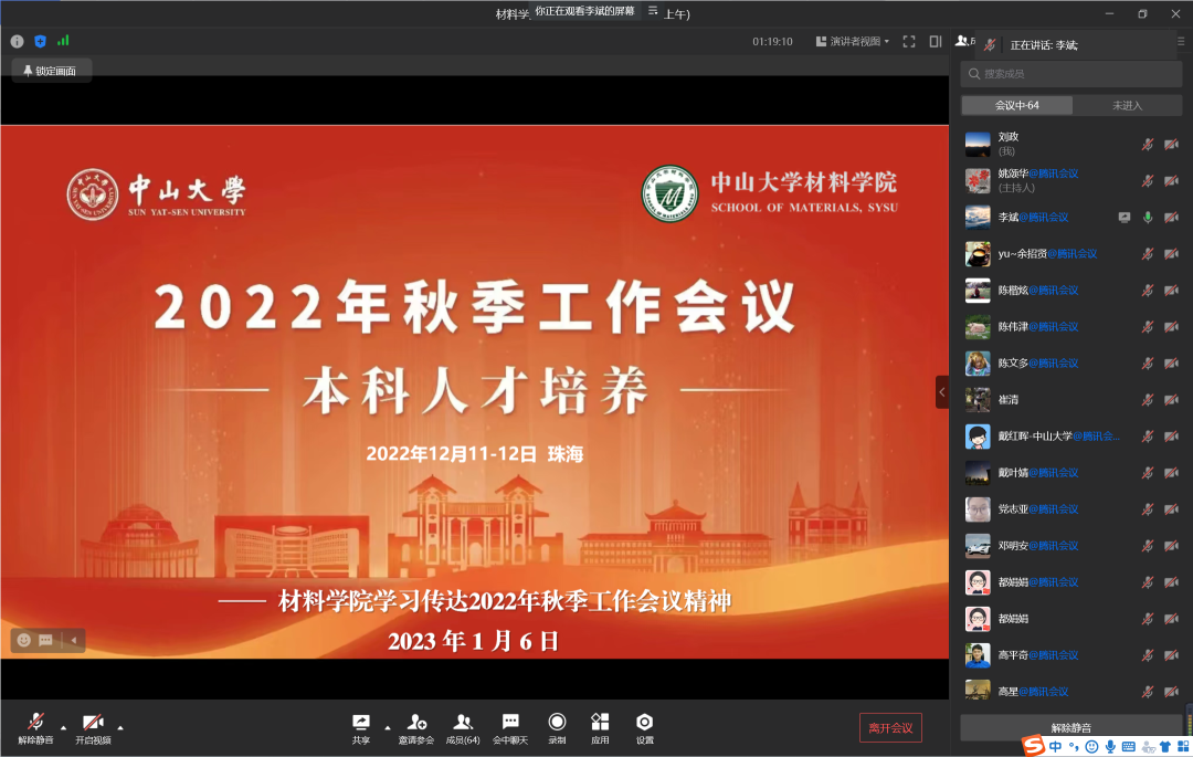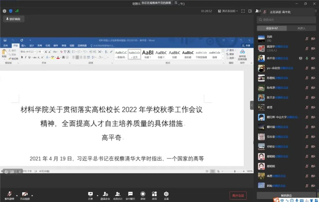 会上,李斌副院长介绍了学校2022年秋季工作会议的整体情况,并重点传达学习了高松校长《以学生成长为中心 以通专融合为路径 全面提高人才自主培养质量》的大会主题报告和陈春声书记的总结讲话。报告指出,要学深悟透党的二十大精神的主旨要义、丰富内涵和实践要求,切实推动党的二十大精神落细落实到学校工作各方面全过程,并就如何激发学生自我成长的内在动力、如何推行十六字人才培养理念,推动学校事业高质量内涵式发展进行了全面阐释。陈春声书记在总结讲话中就学习宣传贯彻党的二十大精神,以高质量党建引领推动高质量内涵式发展,学习贯彻秋季工作会议精神三个方面的内容作了总结。