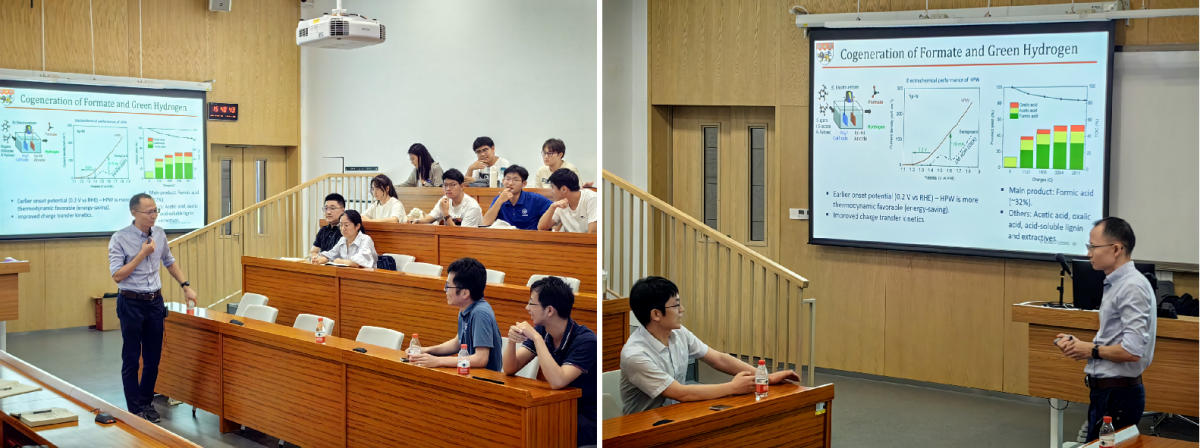 在讲座中,李红副教授以自身的科研经历为背景,介绍了自博士后阶段以来,在酸性、碱性电解水催化剂研发领域的探索历程。在克服了催化剂研发过程中的一系列挑战后,李教授团队成功研发出利用生物废弃物质辅助制备绿氢的多种解决方案。李教授以虾壳、甘蔗渣、快速生长树木为例,介绍了三种已有成效的辅助制备绿氢的方法,同时还提出了正在研发阶段的利用淤泥、废弃塑料为辅助原料的绿氢制造工艺。在此基础之上,进一步提出了生物质废弃物转化为高价值化工原料的关键科学问题,从原料粉碎过程、原料加热方式、成本比较等多个维度展示了应用基础研究的过程,提出了利用地域优势与自身特长解决传统问题的创新思维模式。