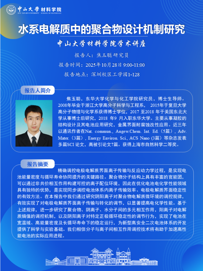 精确调控电极电解质界面离子传输与反应动力学过程,是实现电池能量密度与循环寿命协同提升的关键路径。聚合物分子结构上具有丰富的官能团,可以通过非共价相互作用构建可控的离子配位环境,因此在优化电池电化学性能领域具有独特的优势,是实现同步调控电池体系内离子传输效率、电极电解质界面稳定性的有效方法。在本报告中研究团队通过研究阴阳离子对聚合物电解质微环境的调控规律,有效实现了对电极电解质界面离子传输与转化的调节,以显著提高电化学性能。基于上述规律,进一步研究了聚合物、阴离子、水分子间的多元相互作用,阳离子对电解质熵值的调控机制,以及阴阳离子对特定正极循环稳定性的调节行为,实现了电池在宽温域、高能量密度及长循环寿命下的稳定运行,为新型高安全二次电池体系的开发提供了科学与实验基础。研究团队相信分子与离子间相互作用调控技术将有助于加速高性能电池的实际应用进程。本次报告会介绍研究团队近年来在水系电解质中的聚合物设计机制方面的一些研究进展。